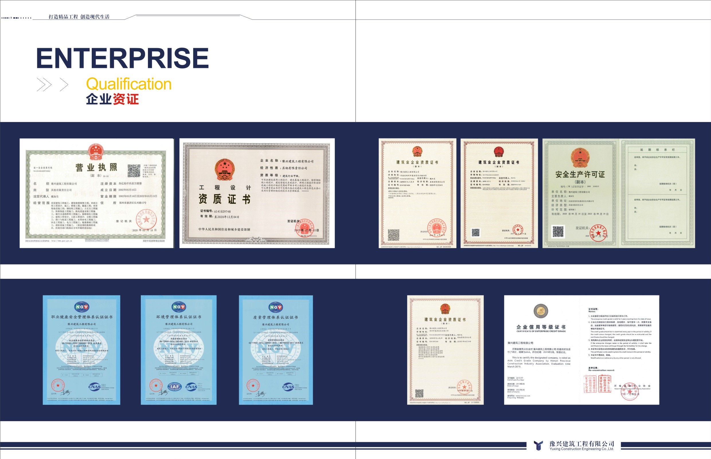 豫興建筑工程有限公司創(chuàng)建于1993年,經(jīng)過2002年改制后,現(xiàn)為一家集房屋建筑安裝、市政公用工程、裝飾裝修、鋼結(jié)構(gòu)、防腐保溫、城市道路與照明、房地產(chǎn)開發(fā)、勞務(wù)分包等多元化的大型現(xiàn)代化企業(yè),具有承擔(dān)工業(yè)與民用建筑、裝飾裝修、市政、鋼結(jié)構(gòu)、防腐保溫、房產(chǎn)開發(fā)等多項生產(chǎn)能力。擁有建筑行業(yè)設(shè)計甲級、建筑工程施工總承包特級、市政公用工程施工總承包一級、機(jī)電工程施工總承包一級、公路工程施工總承包二級、水利水電工程施工總承包二級、冶金工程施工總承包二級、電力與工程施工總承包二級、港口與航道工程施工總承包二級、地基基礎(chǔ)工程專業(yè)承包一級、消防設(shè)施工程專業(yè)承包一級、建筑裝修裝飾工程專業(yè)承包一級、防水防腐保溫工程專業(yè)承包二級、鋼結(jié)構(gòu)工程專業(yè)承包二級、城市及道路照明工程專業(yè)承包三級等多項資質(zhì)。