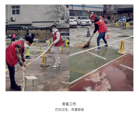 在金基社區的統一安排下,光大管理公司志愿者提前到達核酸檢測點,打掃衛生、布置場地,為開展核酸檢測做好準備工作。檢測開始前,社區人員進行了工作分配,跟志愿者們介紹整個檢測階段的流程、秩序,以確保檢測工作有序進行。