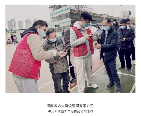 近期,鄭州市新冠肺炎疫情防控指揮部辦公室發布2022年47號、51號文件,決定在金水等城區開展核酸檢測,迅速阻斷疫情傳播。為協助做好疫情防控工作,河南省光大建設管理有限公司積極響應社區號召,成立一支志愿者團隊,先后于2022年3月21日、26日兩次助力了金基社區全員核酸檢測工作。