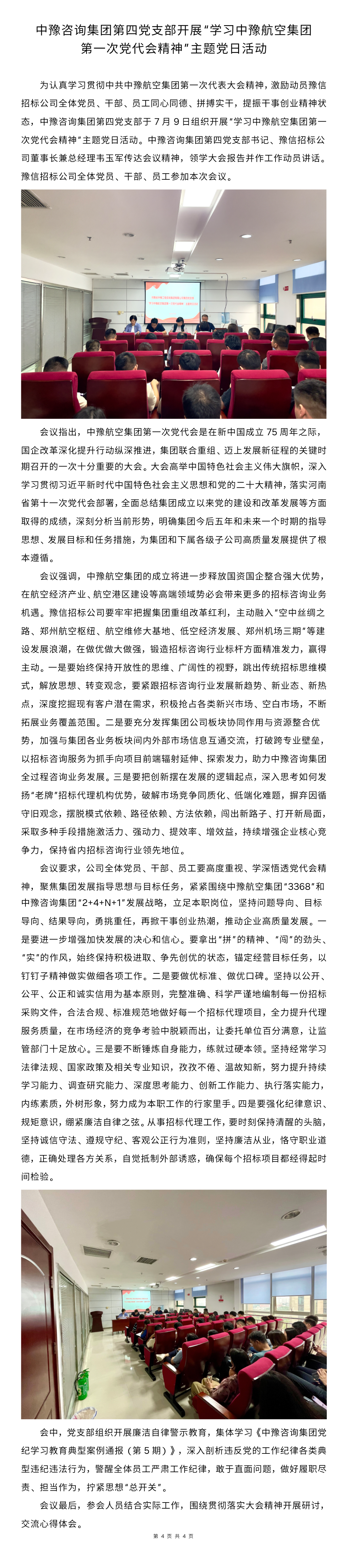 中豫咨詢集團(tuán)第四黨支部開(kāi)展“學(xué)習(xí)中豫航空集團(tuán) 第一次黨代會(huì)精神”主題黨日活動(dòng)